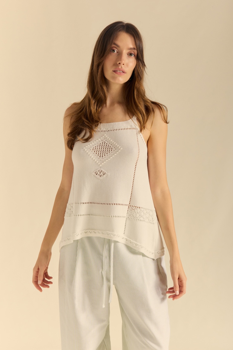 Blusa de malha sem mangas com modelagem em A. Malha lisa combinada com detalhes vazados e uma estampa que forma o desenho de uma mariposa no centro das costas. Composiรงรฃo: 100% Algodรฃo
