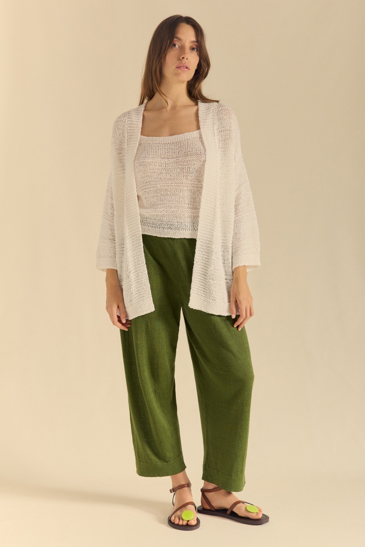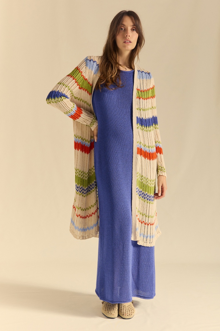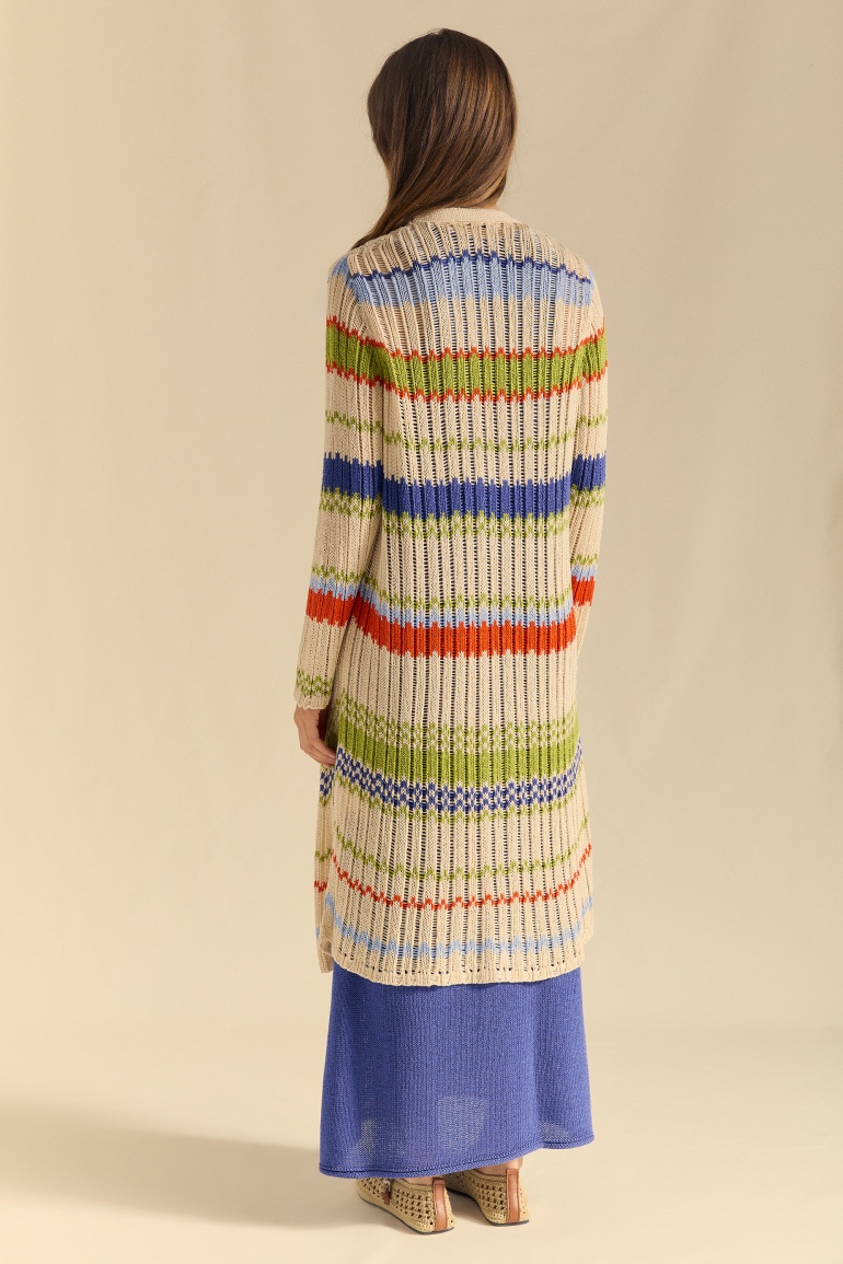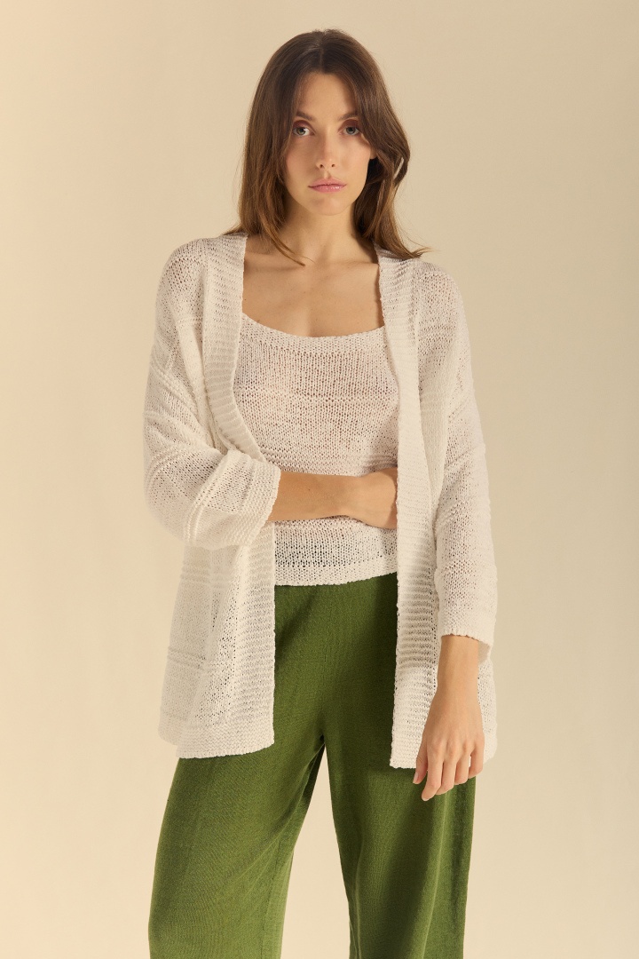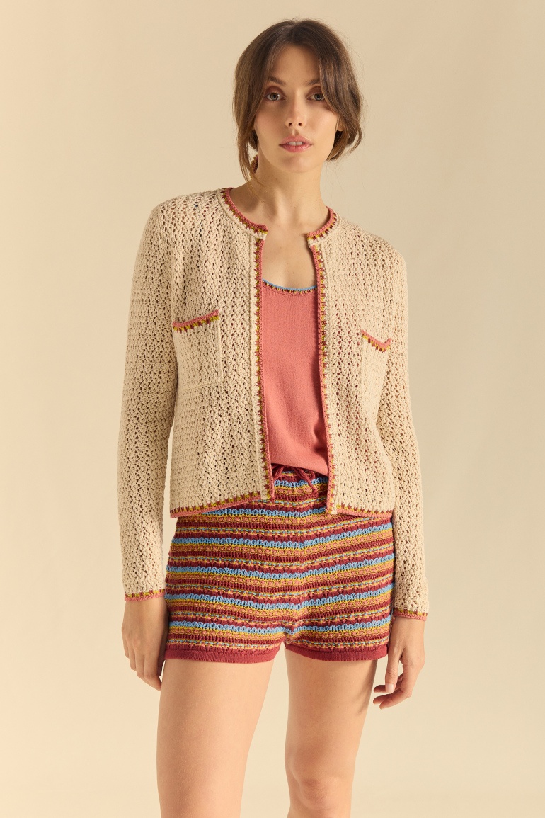 Jaqueta de malha elegante com mangas inseridas. Decote redondo com detalhe em viรฉs tricolor contrastante com o corpo da peรงa. Esse detalhe tambรฉm aparece nos punhos, na barra e ao longo do decote.