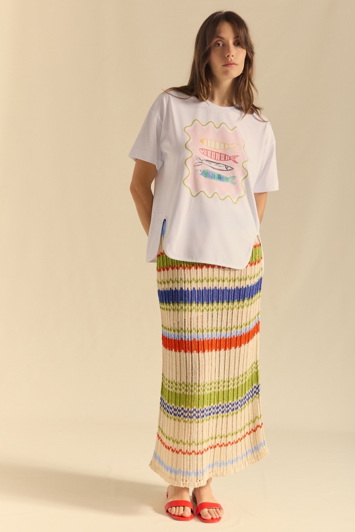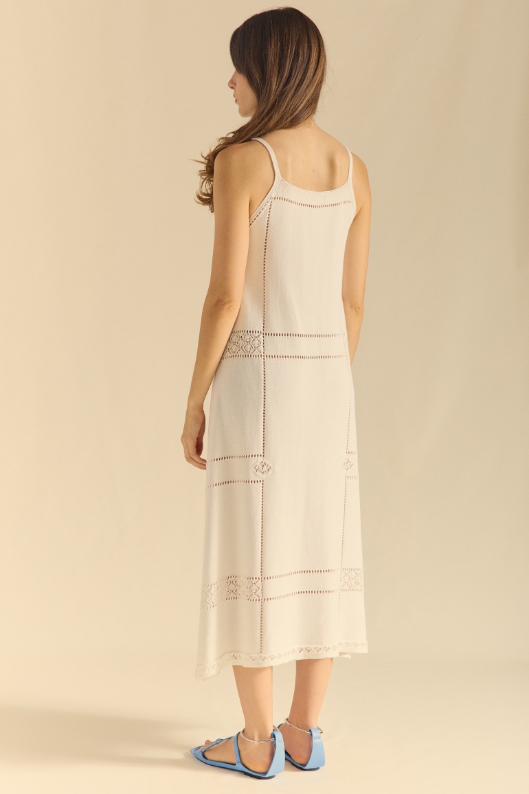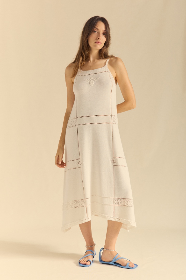 Vestido de malha com alรงas, decote reto e silhueta em A a partir do busto. Apresenta detalhes vazados por toda a peรงa e uma estampa em formato de borboleta feita de pequenos pontos.