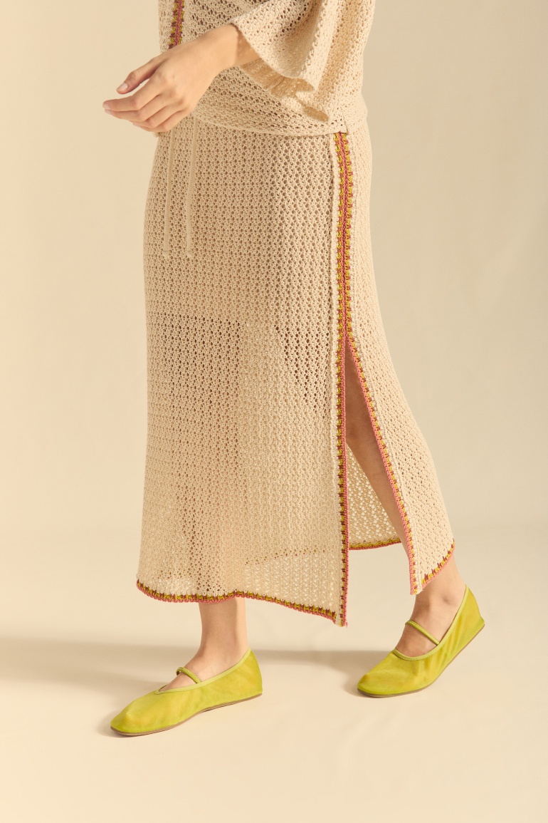 Um vestido de tricรด com formas orgรขnicas que lembram folhas de palmeira tropicais. Possui gola redonda ampla, รฉ sem mangas e tem barra assimรฉtrica.