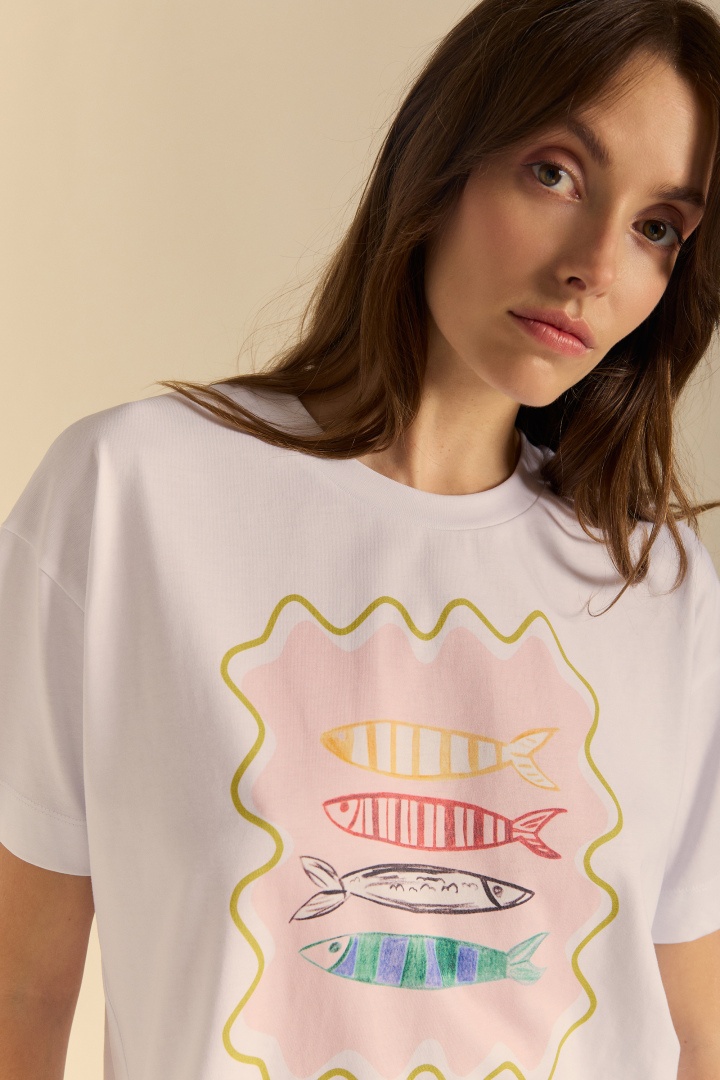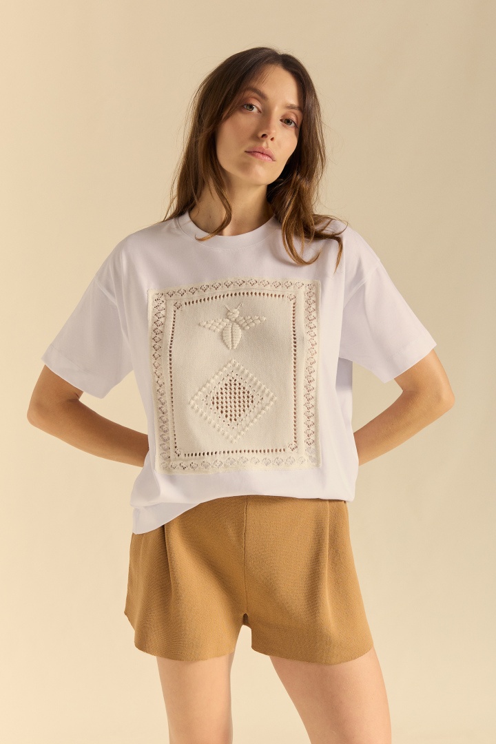 Camisa com mangas caรญdas e amarraรงรฃo no centro do decote. Tricรด liso combinado com detalhes vazados e estampa de bolinhas formando o desenho de uma borboleta na parte frontal esquerda do peito.