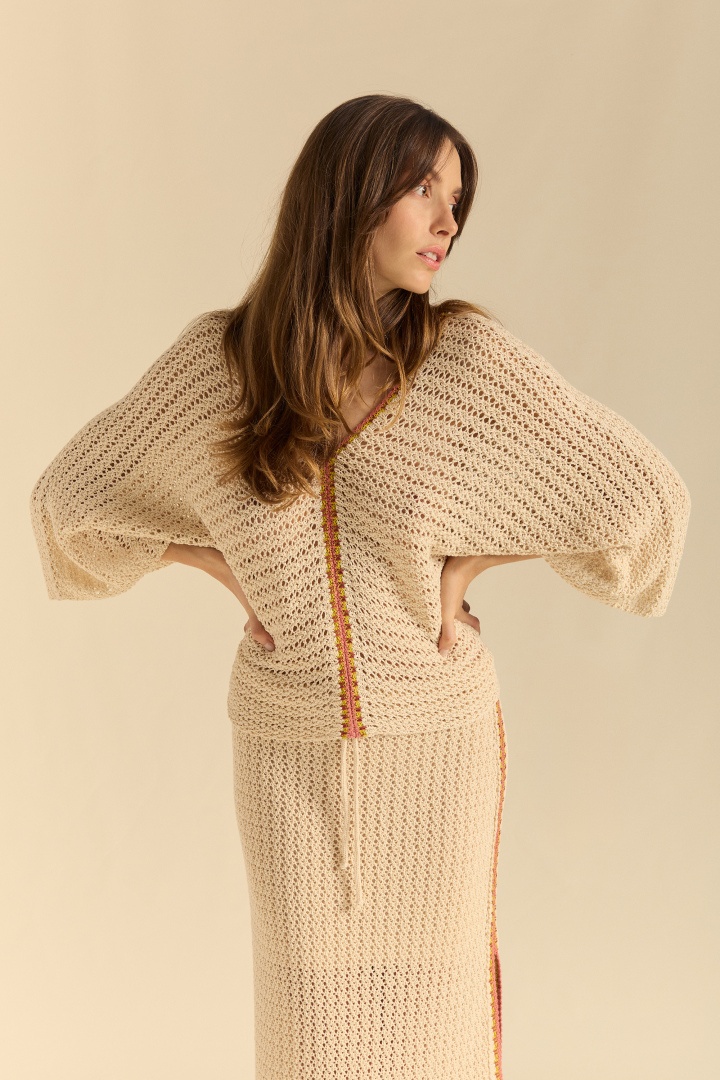 Suรฉter de tricรด sofisticado com mangas largas. Composto por duas partes que se unem no centro da frente e das costas, criando um decote em V complementado pelo acabamento do corpo,