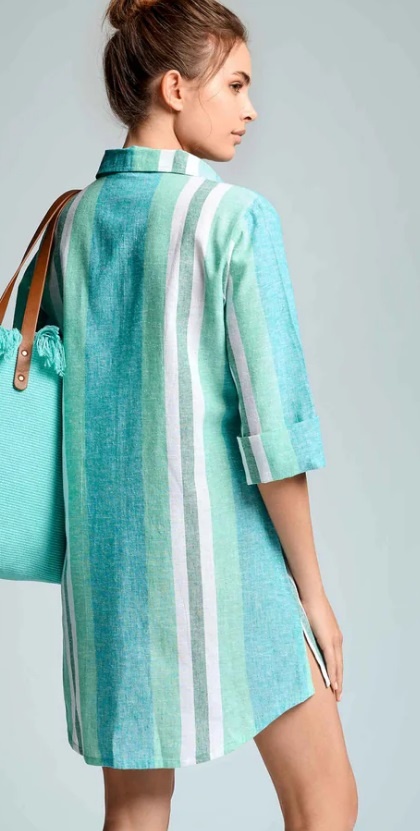 O vestido camiseiro Eleanor de corte direito รฉ uma peรงa fresca e versรกtil, ideal para o verรฃo, com um estilo simples e requintado. Confecionado numa mistura leve de viscose e linho com um estampado ร s riscas, combina conforto e respirabilidade num design minimalista e elegante.