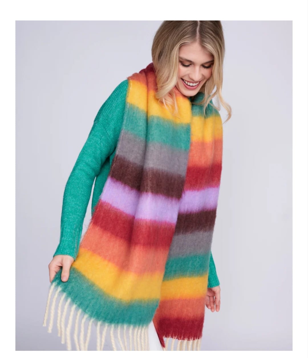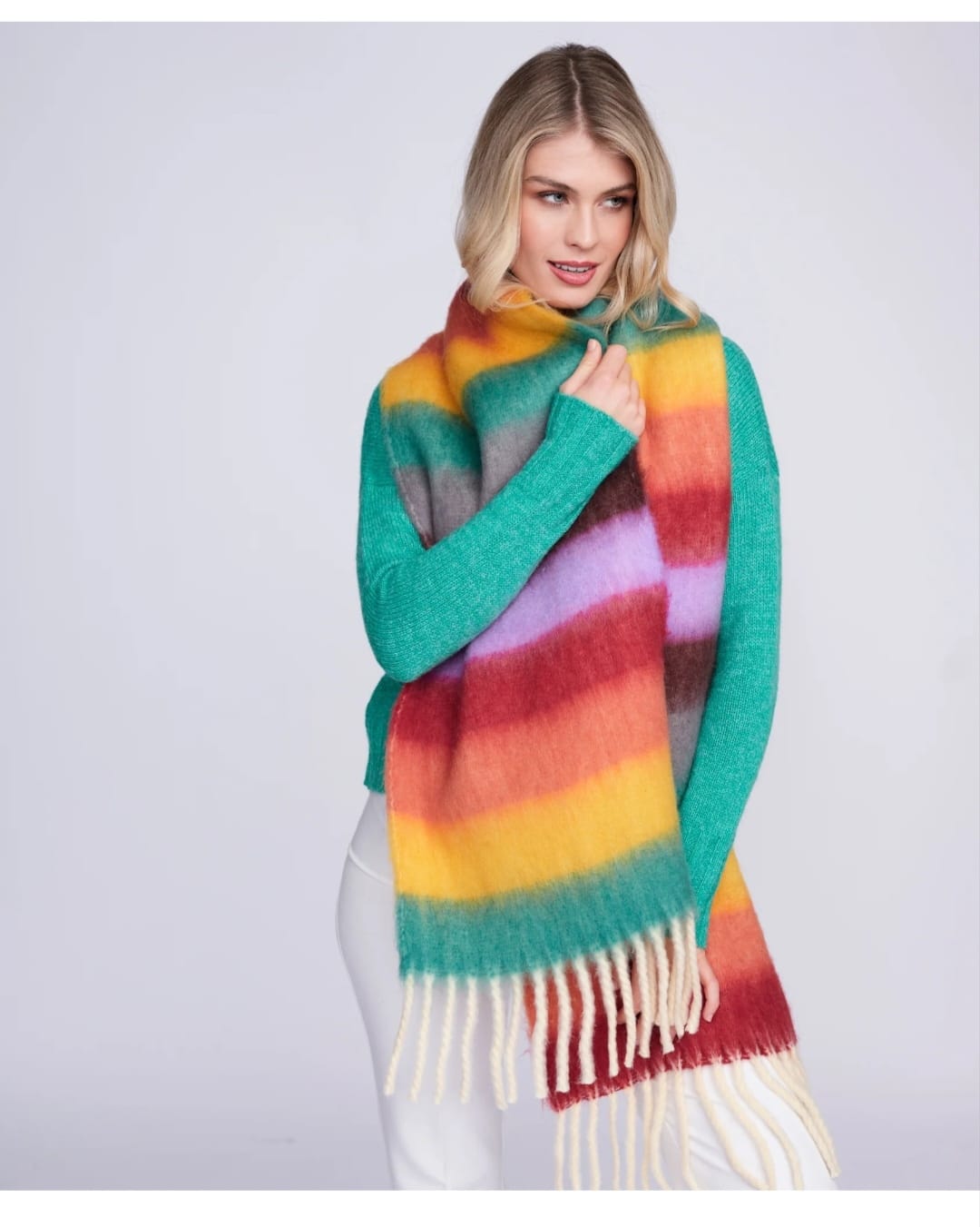 Dê um toque de estilo ao seu visual com o cachecol Beth da Pia Rossini! Com um design listrado colorido e confeccionado em tecido de alta qualidade, este cachecol oversized oferece aquecimento e conforto. A barra com franjas e as bordas desfiadas adicionam um toque boho-chic. Perfeito para dar um toque de cor e um elemento moderno a looks casuais.