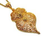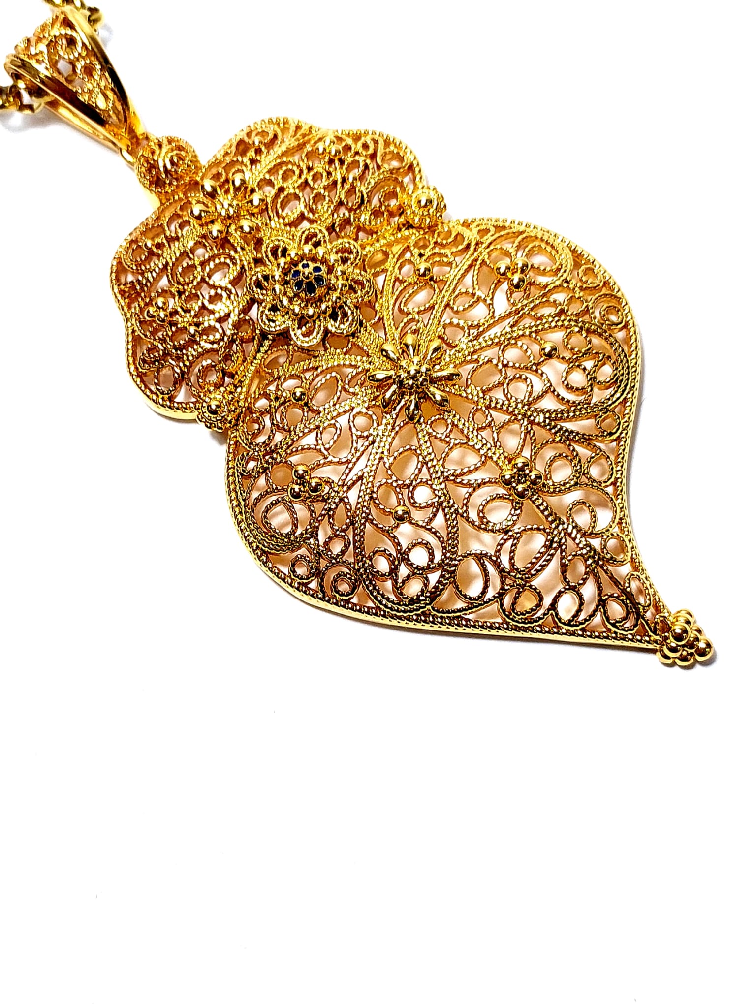 Colar com pingente em formato de coração com delicado trabalho em filigrana artesanal, apresentando design vazado e detalhes ornamentais que conferem sofisticação, leveza e elegância à peça.