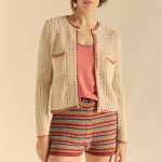 Jaqueta de malha elegante com mangas inseridas. Decote redondo com detalhe em viรฉs tricolor contrastante com o corpo da peรงa. Esse detalhe tambรฉm aparece nos punhos, na barra e ao longo do decote.