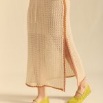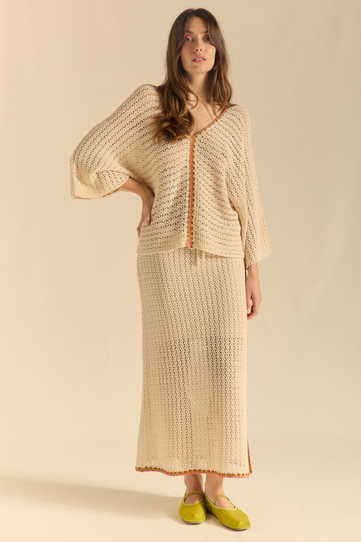 Saia de fita em tecido de malha com acabamento contrastante em três cores. Possui fenda lateral e cintura com cordão para um ajuste perfeito.